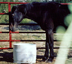 Noche's body bowed gracefully to his knees, and was gone. Back into the teaching house, we gathered to listen to Linda and what she had to say. On an alter in the main teaching room, the pictures less than eight hours old in Linda's possession became the space holders honoring Noche. Once back in my B&B room I collapsed on the bed without dinner to drift exhausted into sleep. Images began to float before my closed eyes of Noche as a young colt running with his mother. Then as a young horse to mature horse, some hard times, and then life with this one owner he really loved, a man with a floppy hat. He showed me his life at Epona and the many walks in the desert with Linda. Then sleep possessed me. When I awoke that morning too early to rise yet, I was flooded with a poem. It had been about three years since my last poem, (sounds like a confession) so I let it come in. The next day Linda was alone in the teaching room near the alter in quiet reflection and I shared about the images I had seen, she said, "Go look on the alter." In the night, a picture had been placed on the alter, of a man in a floppy hat, just like I'd seen in the vision. It was Steve, her husband. My body rushed with goose bumps as Here is that poem that came from the other side. Over the next few days we were able to go visit Noche's body and say our private good-byes before his burial. When I took my turn it was right before the man with the backhoe was to arrive to carve out the gravesite. I asked Linda if I could touch his body. Lying there with his head gently bowed and kneeling gracefully, I stroked his body and felt another wave of grieving take hold. I was overtaken in silent sadness and deep gratitude in the same moment. I didn't get to be with my sweet horse when he passed on and here in the burning desert sun I got to feel my horse's body through Noche's, and say good-bye to one of my teachers. When the backhoe man arrived he saw this person stroking the body and inquired if the Vet was on their way? He thought Noche was still alive. We all got to laugh about it afterwards. A silly release we all needed. In the power of Noche's healing words and the gifts from his dying process, I've returned to my profound trust in myself. It is still with me, and deepening my way into the Mystery. Noche gave me that initiation into the heart of the horse. It took awhile, but I have fully grieved for my sweet Abu. I also learned from the painful fallout of holding onto sorrow too long. And, I learned the value of being authentic to ones self, even if there seems to be no agreement. At Epona, I fell into love with my "deep feeler-within." I learned to listen and trust what I hear from horses. And, I also witnessed the deep level need for personal work, to begin bridging the profound chasm within the human heart from so many years of denied feeling. Cindy Jarrett, 2004 * There will be more healing stories chronicled over time on this page. Check back for more heart developments. * All